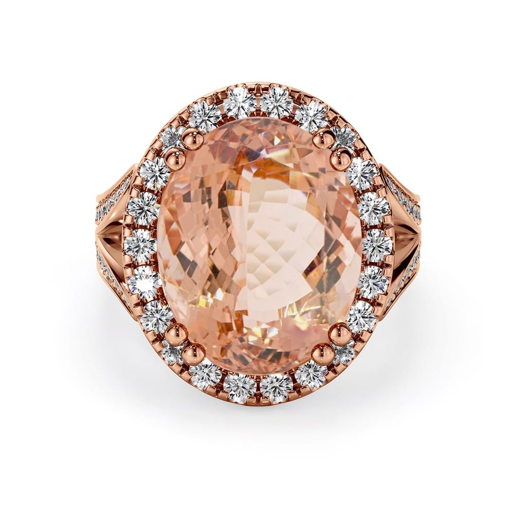 This exquisite morganite and diamond ring is the perfect choice for those seeking a unique and elegant piece of jewellery. Featuring a stunning oval cut peach morganite as the centrepiece, surrounded by a halo of sparkling brilliant cut diamonds, this ring is sure to make a statement. The split band adds a touch of modernity to the classic design, while the 18ct rose gold complements the warm tones of the morganite perfectly.\n\nMorganite = 8.46ct\nDiamonds = 1.13ct