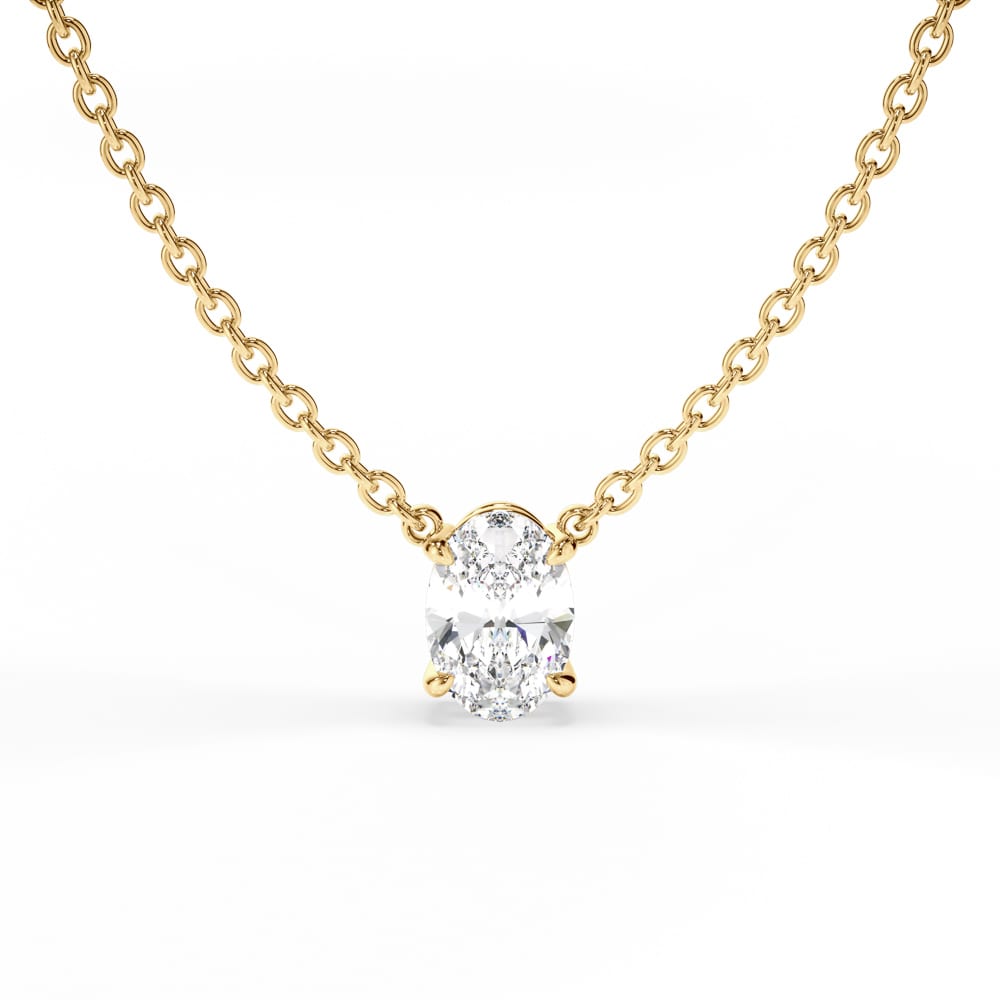 Crafted in 18ct gold, this elegant necklace showcases an oval-cut diamond set vertically in a refined four-claw setting, creating a striking north-to-south silhouette. Accompanied by a 45cm trace chain, this timeless design embodies understated luxury.