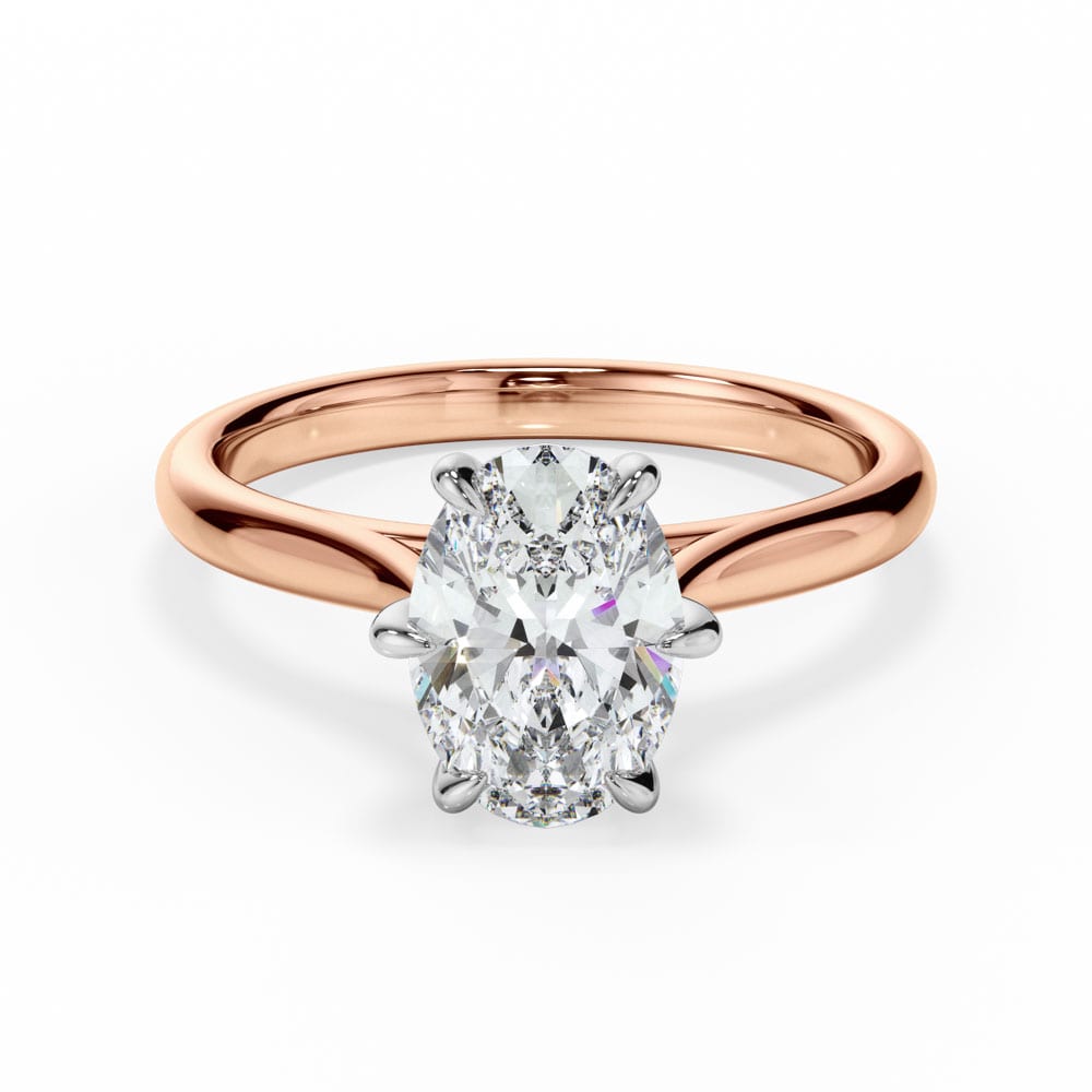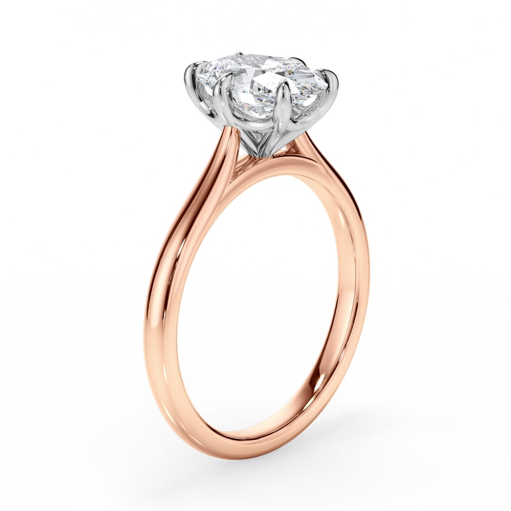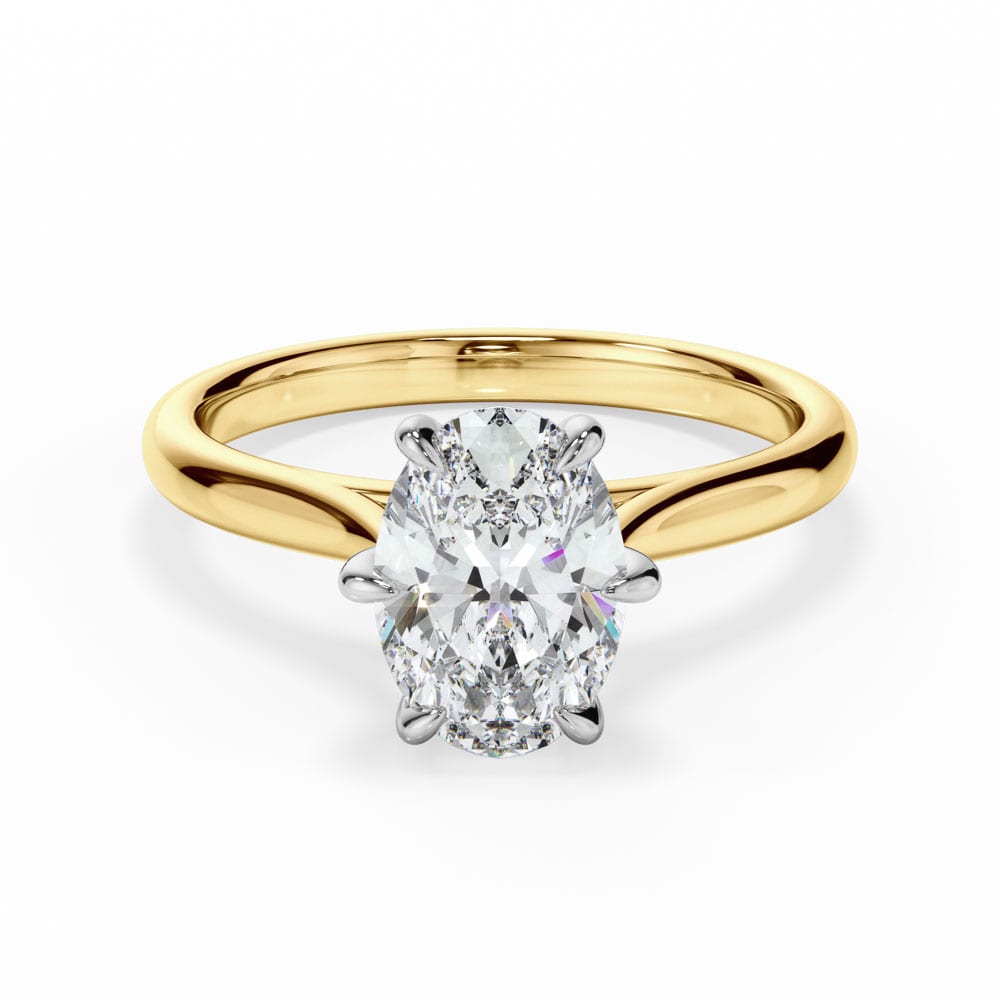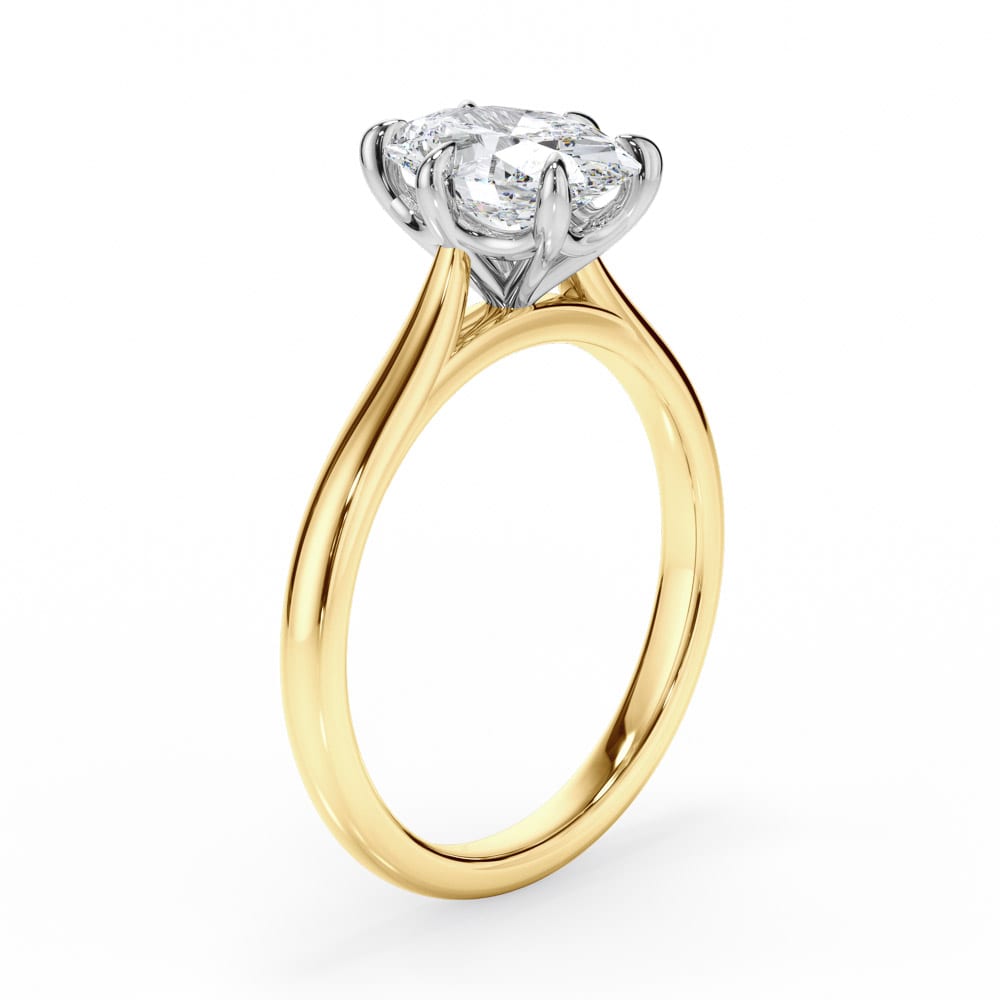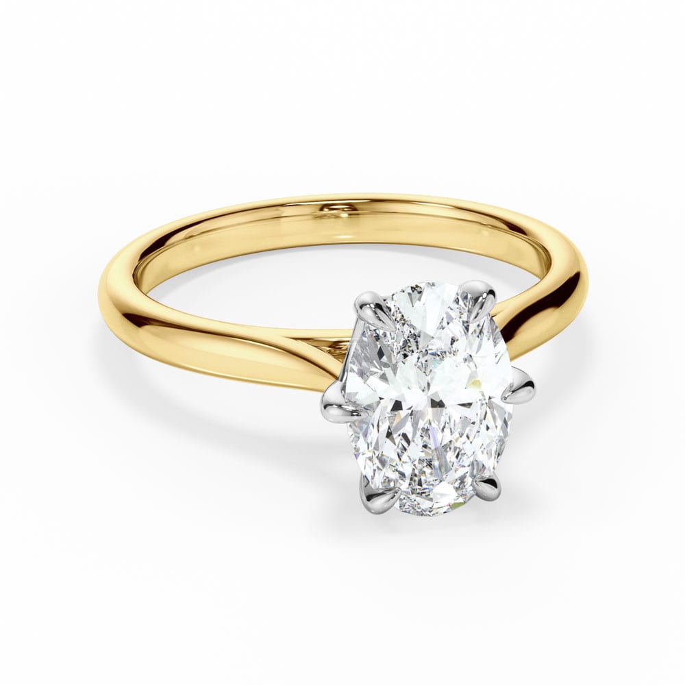 Classic elegance meets refined craftsmanship in this 18ct yellow and white gold solitaire engagement ring. A stunning oval-cut diamond is securely set in a white gold six-claw setting, allowing for maximum brilliance. The high-polished yellow gold 1.9mm band provides a sleek and timeless finish, complemented by a 7.00mm setting height for perfect proportions. Expertly crafted by Robert Cliff Master Jewellers.