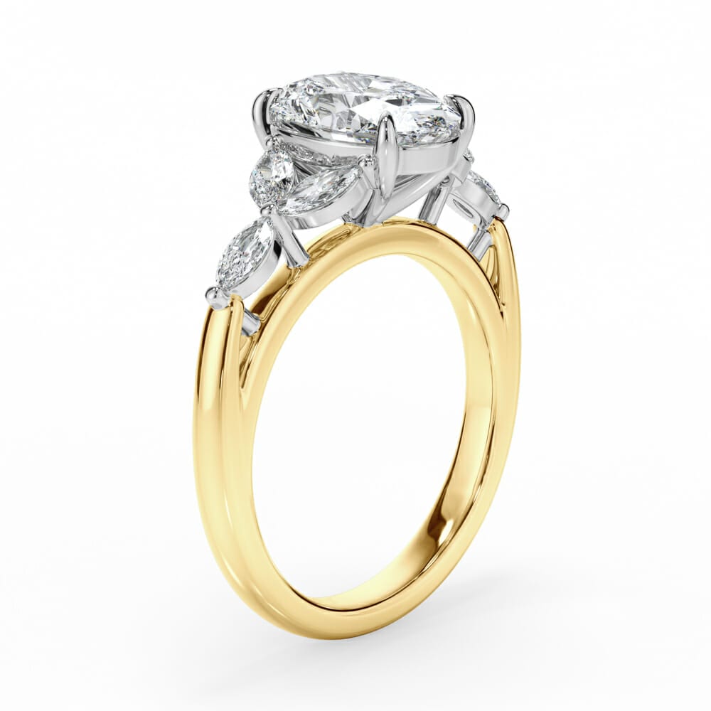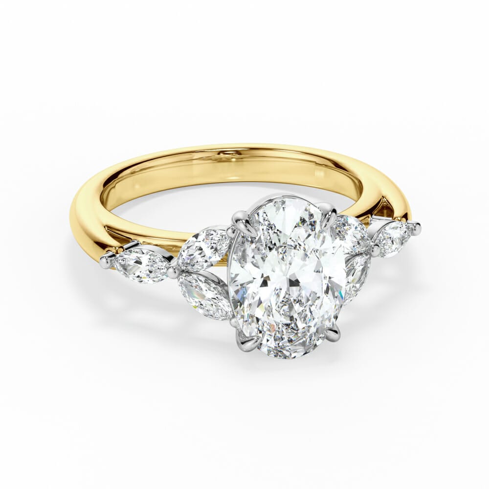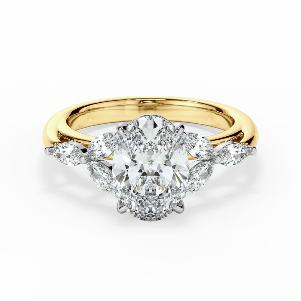 Crafted in 18ct gold by Robert Cliff Master Jewellers, this elegant engagement ring features a white gold four-claw setting securing a stunning oval-cut diamond. Three marquise-cut diamonds on each side enhance its brilliance, creating a beautifully tapered design. The high-polished yellow gold band measures 2.4mm in width, with a setting height of 7.5mm, offering a striking yet refined look.