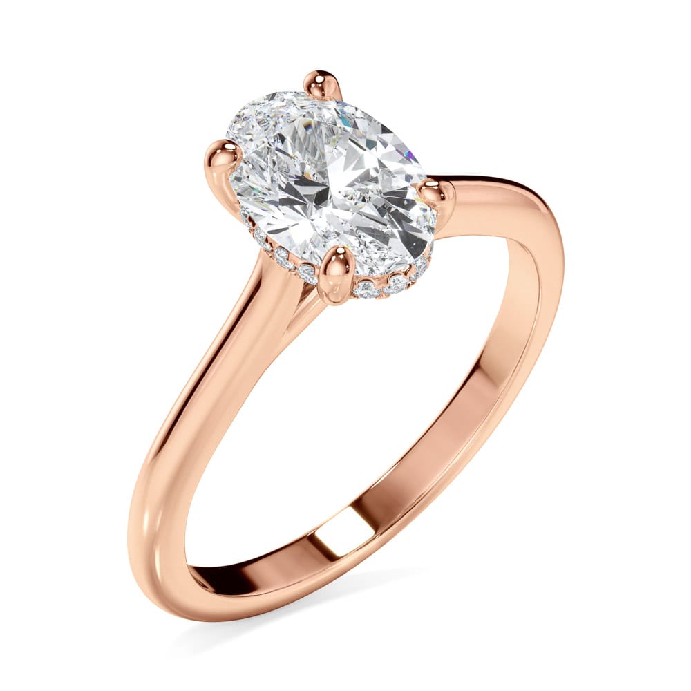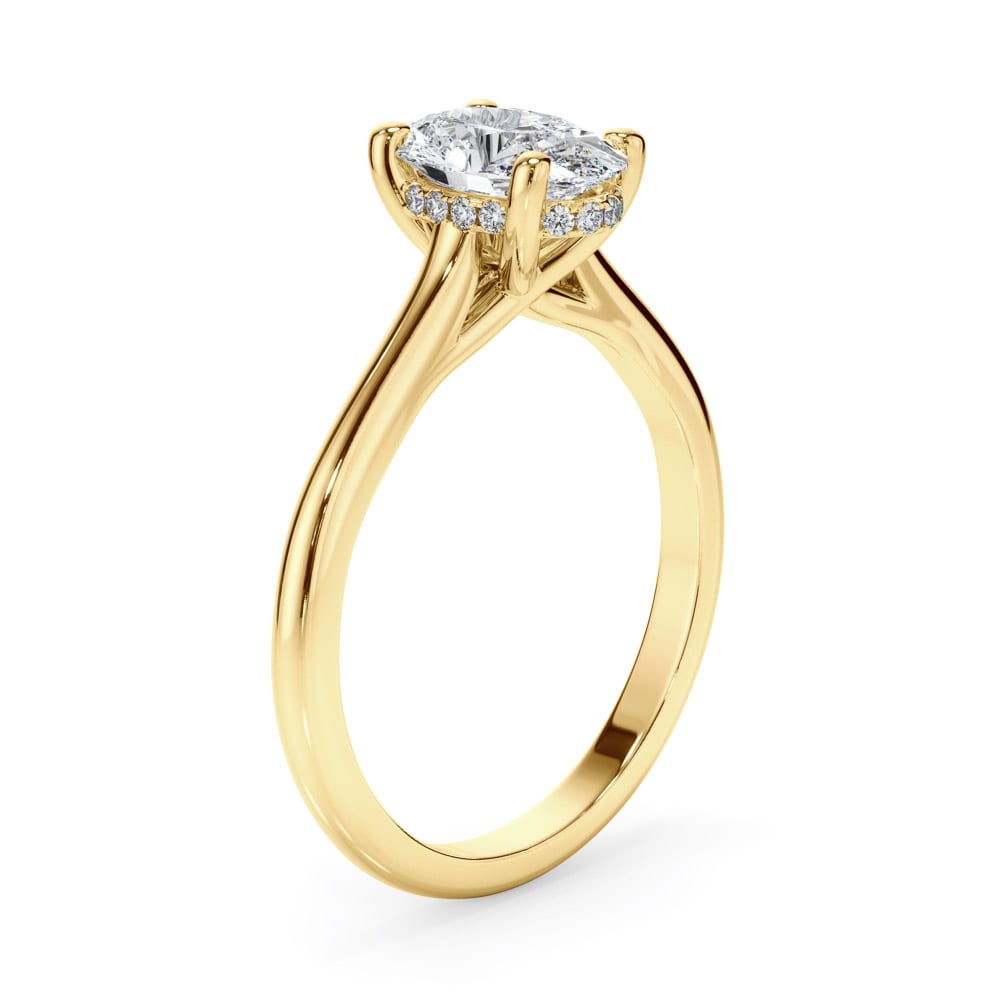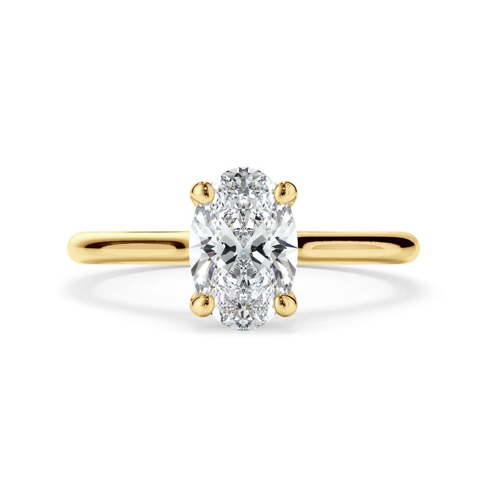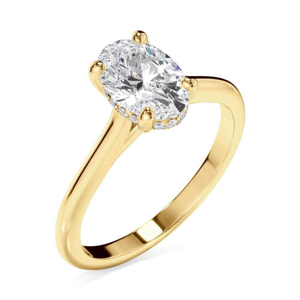 This 18ct gold engagement ring features a stunning oval cut diamond, elegantly four claw set at the centre. A hidden halo of brilliant cut diamonds beneath the setting adds a subtle touch of sparkle. The high polished 2mm band, along with a 7mm setting height creates a refined and sophisticated silhouette. Expertly crafted by Robert Cliff Master Jewellers.