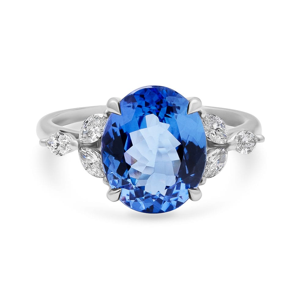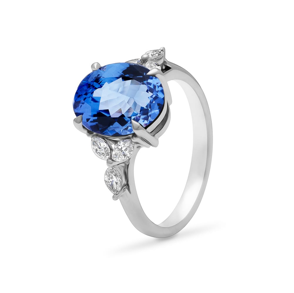 Discover the allure of rare colour with this 18ct white gold Tanzanite and diamond ring, crafted by Robert Cliff Master Jewellers. A striking oval cut blue tanzanite, celebrated for its vivid hue, is secured in a classic four-claw setting. On either side, claw-set marquise cut diamonds add brilliance and balance to the design. Finished with a rounded, high-polished white gold band, this handcrafted ring is perfect as a luxurious gemstone dress ring or a unique anniversary piece.