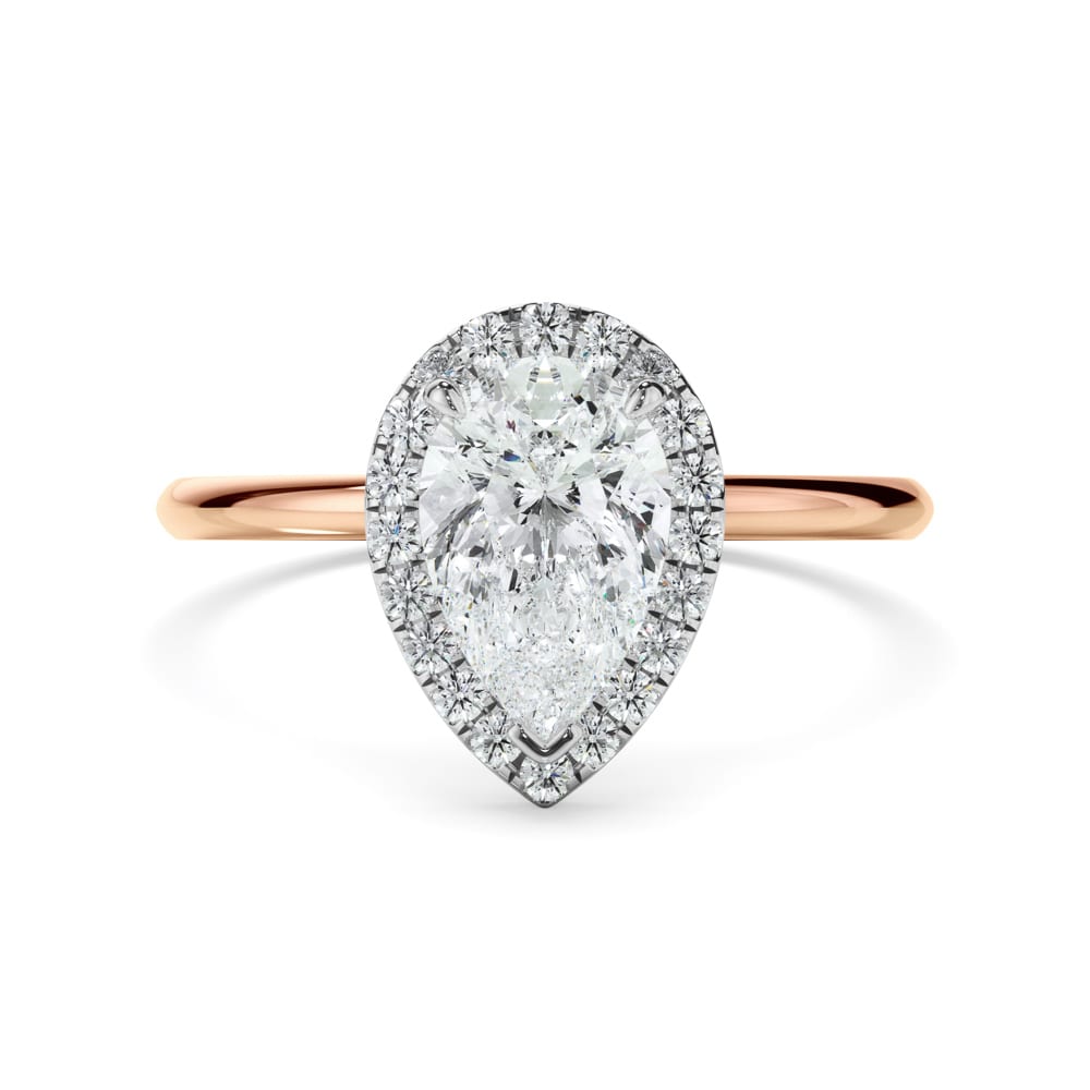 This 18ct gold pear-cut diamond halo ring features a stunning three-claw set pear-cut mined diamond at the centre. A halo of claw-set brilliant-cut diamonds enhances its brilliance, adding a timeless touch of elegance. The rounded 1.9mm band and 6.5mm setting height create a refined and sophisticated silhouette. Designed by Robert Cliff Master Jewellers.