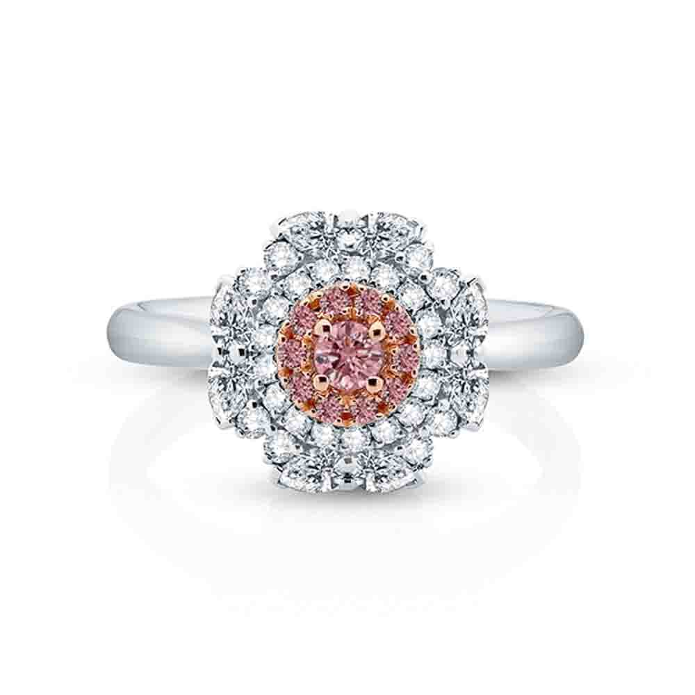A stunning Art deco inspired dress ring featuring pave-set Argyle pink diamonds Surrounding the pink diamonds are claw-set brilliant cut diamonds Made in 18ct rose and white gold.\n\nArgyle pink diamonds = 0.18ct\nDiamonds = 0.59ct\n(Only One Available)