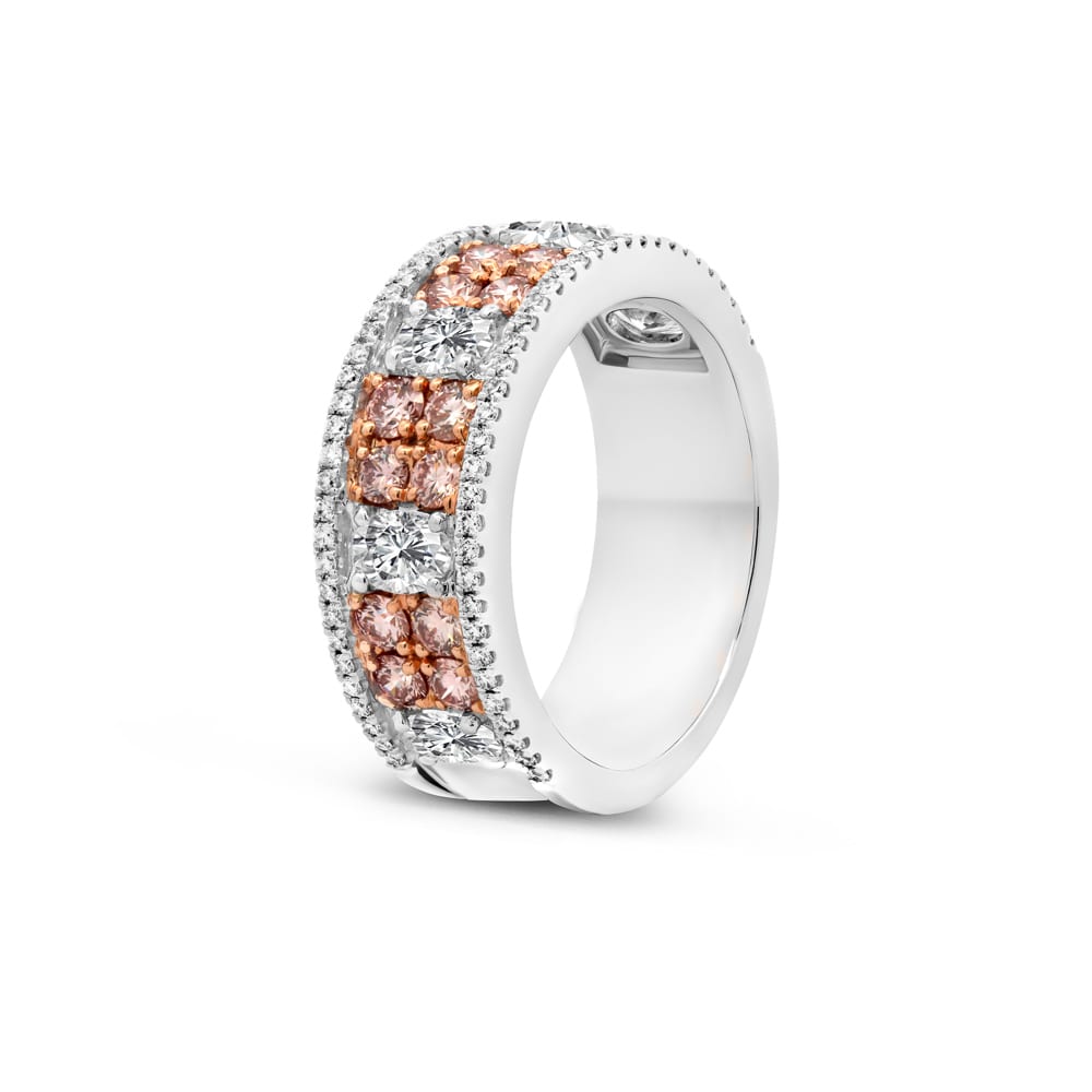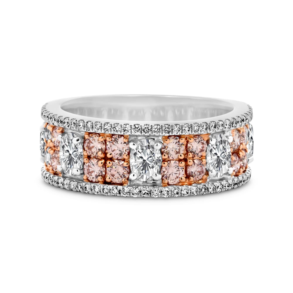 An exquisite platinum and 18ct rose gold diamond ring, measuring 7.50mm in width, this design celebrates the rare beauty of pink and white diamonds. The centre section features alternating groups of claw-set brilliant-cut pink and white diamonds, creating a captivating interplay of colour and sparkle. Additional brilliant-cut diamonds are claw-set along either side of the band, enhancing its brilliance and refinement. Meticulously crafted by Robert Cliff Master Jewellers.