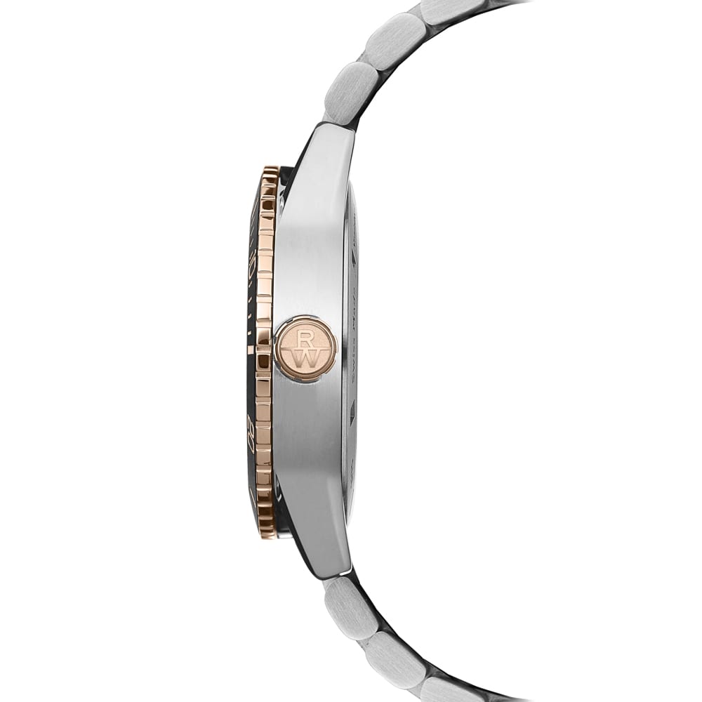 The Freelancer Diver blends refined elegance with robust performance. Powered by the Calibre RW4200 automatic movement with a 41-hour power reserve, it features a gradient black dial with Super-Luminova® indexes and a black ceramic bezel framed in rose-gold PVD steel. Water-resistant to 300 m, this 42 mm timepiece embodies the adventurous, independent spirit of the Freelancer collection, where luxury meets endurance.