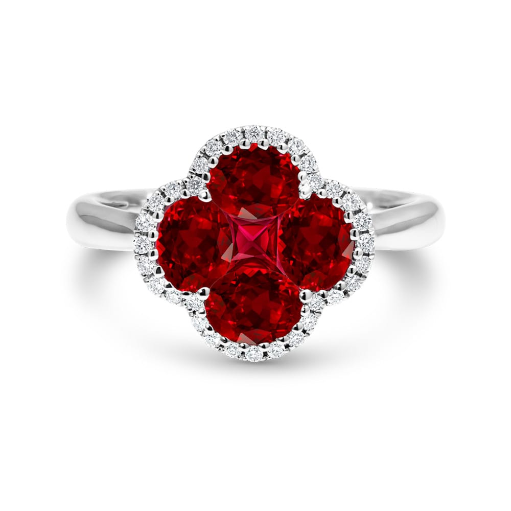 Add a touch of timeless beauty with this 18ct white gold ruby and diamond clover ring, exclusively designed by Robert Cliff Master Jewellers. The centre showcases a unique cluster of oval and princess cut rubies, invisibly set to create a seamless clover-inspired design. Surrounding the rubies, a micro claw-set halo of brilliant cut diamonds adds brilliance and contrast. Finished with a sleek rounded band in polished white gold, this ruby and diamond ring is the perfect choice for an anniversary, special occasion, or statement dress piece.