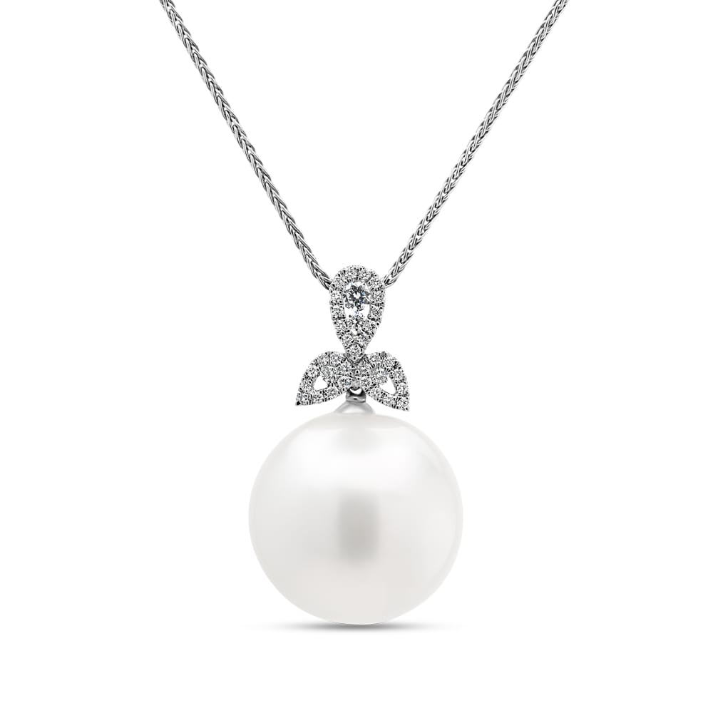 This elegant 18ct white gold South Sea pearl and diamond pendant features a lustrous 17mm South Sea pearl, beautifully accented by sparkling Brilliant Cut Mined Diamonds. The diamonds enhance the natural beauty of the pearl, adding a brilliant touch of sophistication to the design. Perfect for any occasion, this pendant is a timeless addition to any jewellery collection.