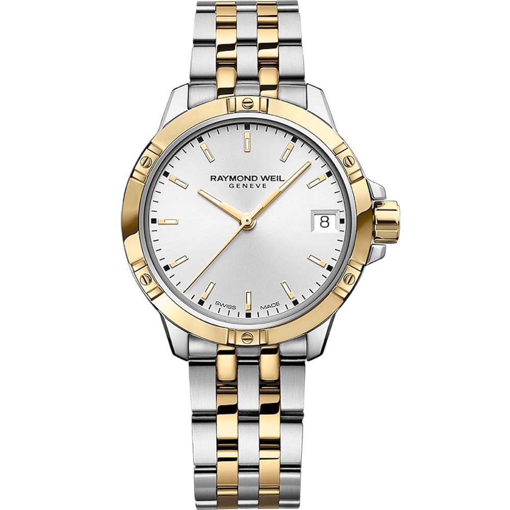 Sleek and versatile, the Tango 30mm Quartz watch is crafted in stainless steel with yellow gold PVD plating for a refined two-tone finish. The sunrayed white dial features slim baton indexes, a date window at 3 o’clock, and hands treated with Super-LumiNova® for enhanced visibility. Framed by a signature six-screw bezel, the case is paired with a 5-row bracelet and secure folding clasp. A sapphire crystal and screwed-down crown provide 100m water resistance. Blending elegance and function, this timepiece reflects RAYMOND WEIL’s timeless design and Swiss precision.