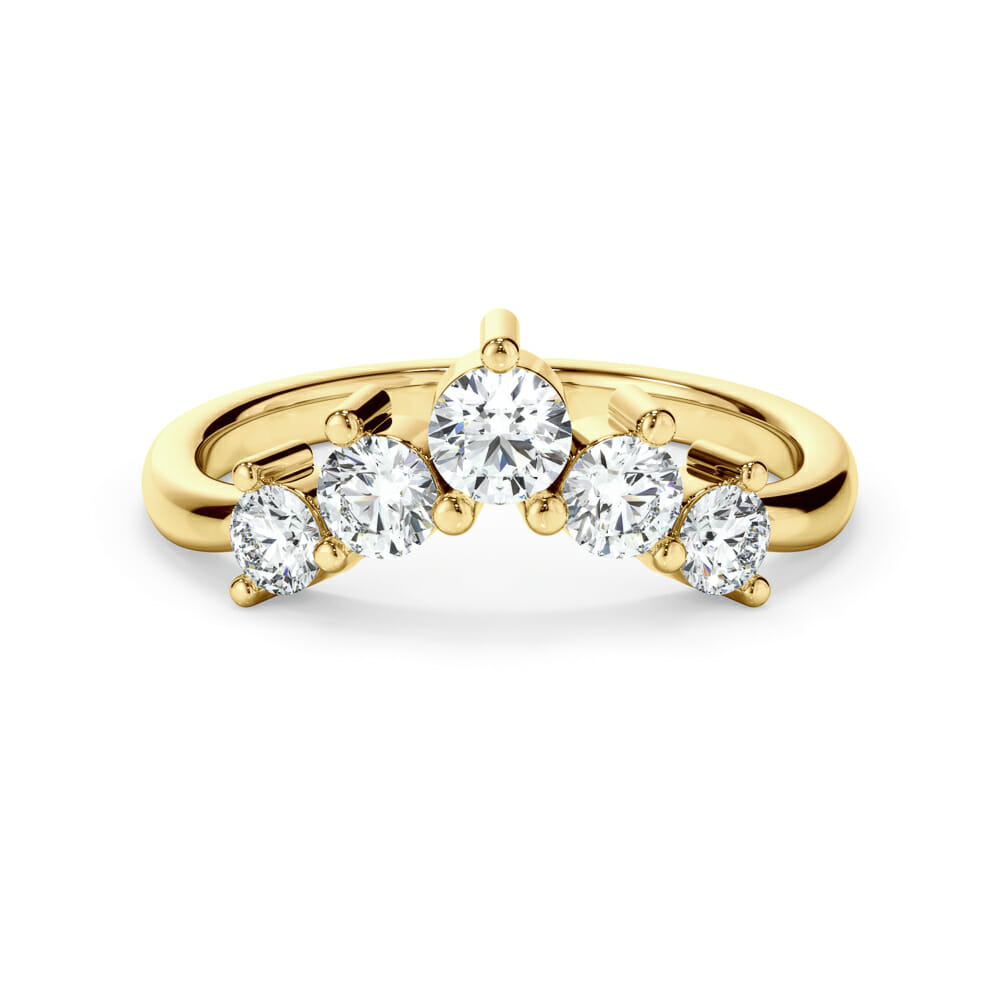 Designed with elegance and distinction, this 18ct gold ladies wedding ring features a graceful curved ‘crown’ adorned with claw set brilliant cut mined diamonds. The setting height of 3.4mm adds dimension and sparkle, perfectly complemented by a high polished 2mm wide band.