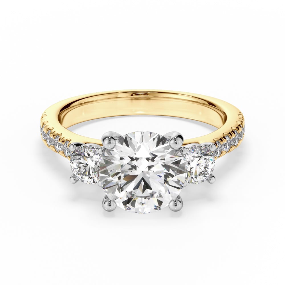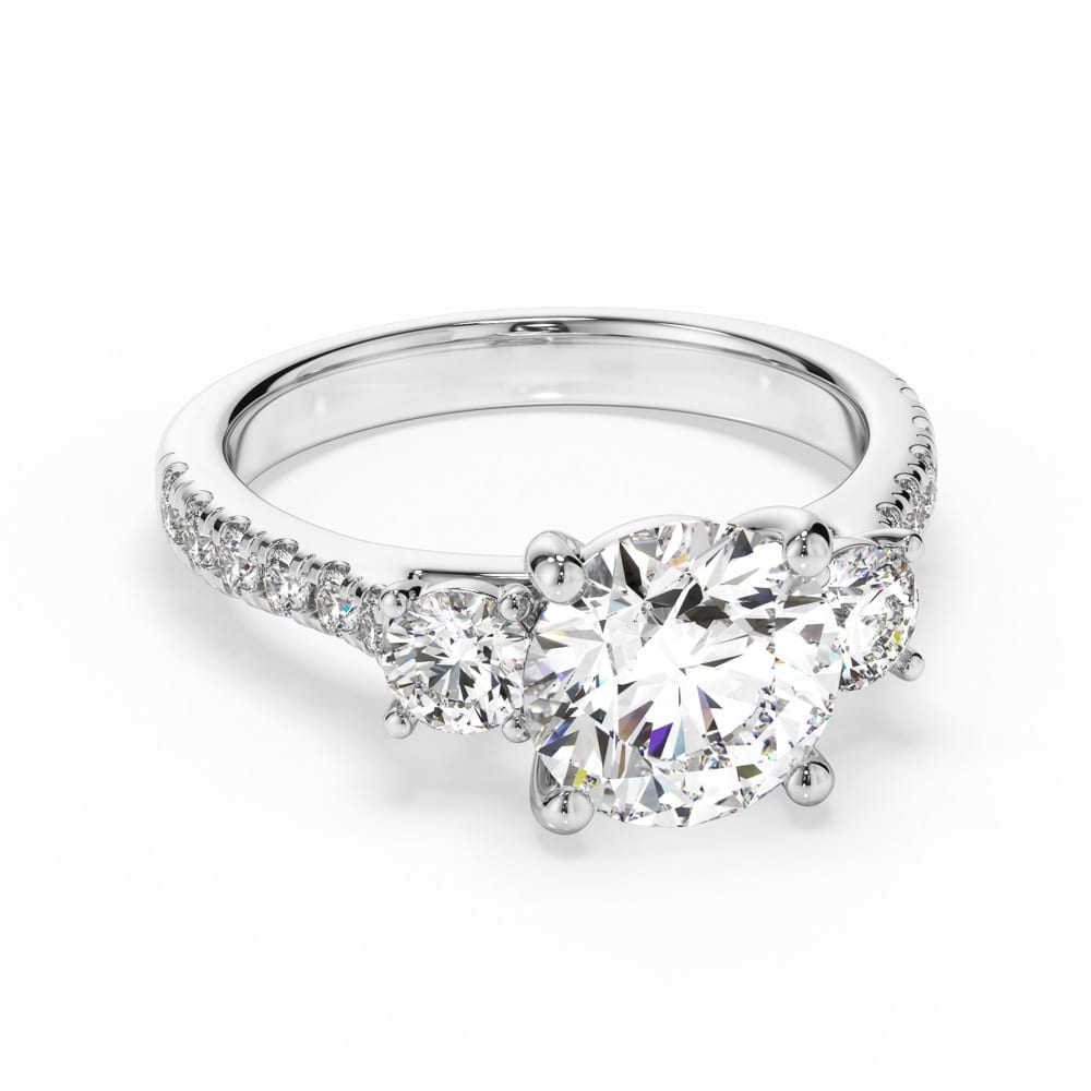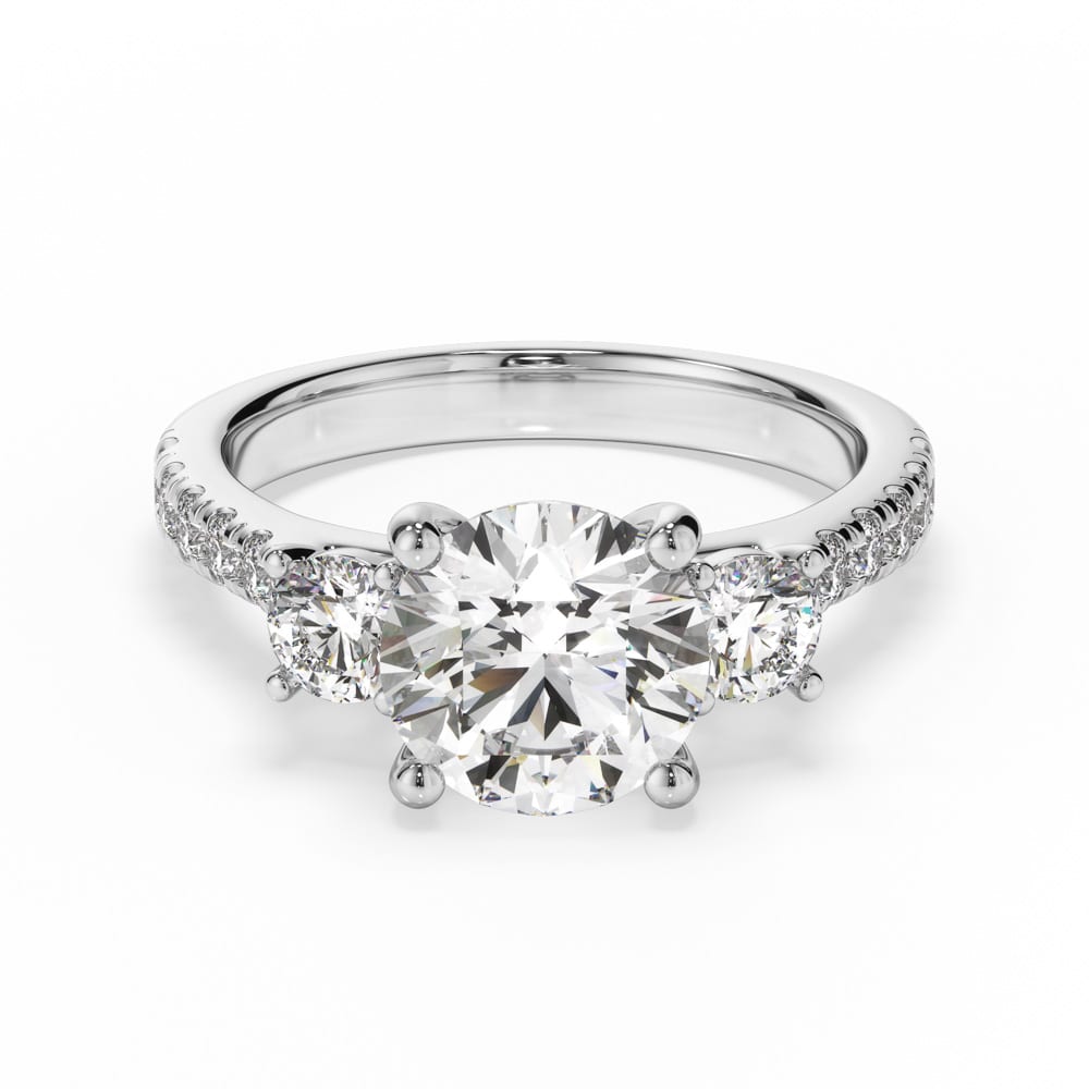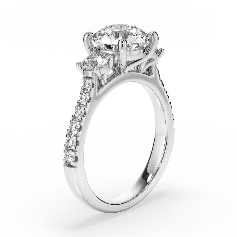 A beautifully crafted 18ct white gold trilogy engagement ring by Robert Cliff Master Jewellers. Showcasing a brilliant cut mined diamond in a secure four claw setting at the centre, this exquisite design boasts a setting height of 7.5mm. Flanking the centre stone are two claw set brilliant cut mined diamonds, enhancing its brilliance. The 2.2mm wide band is elegantly adorned with additional claw set brilliant cut diamonds, creating a seamless sparkle from every angle.