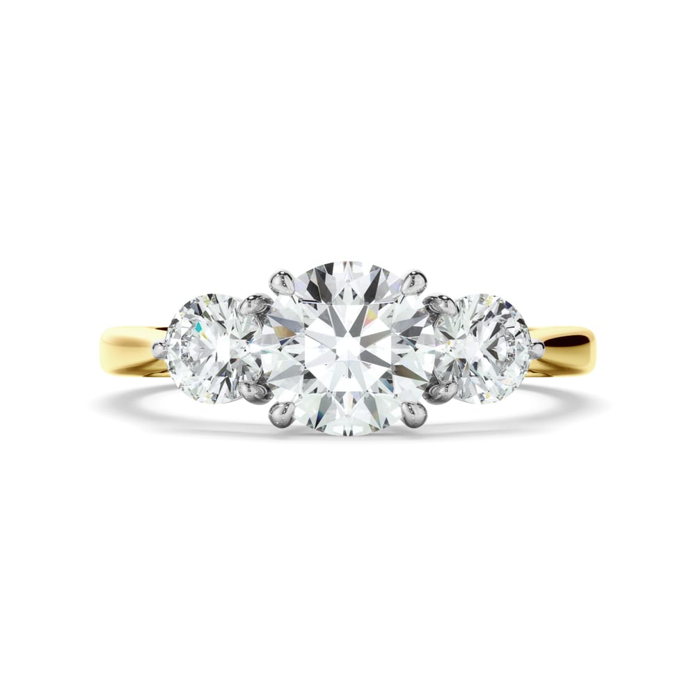 This 18ct gold trilogy engagement ring features a stunning brilliant cut diamond at the centre, white gold four claw set for maximum brilliance. Two smaller brilliant cut diamonds white gold four claw set sit elegantly on either side, enhancing its timeless beauty. The high polished, tapered yellow gold rounded 2mm band and 6.2mm setting height create a refined silhouette. Expertly crafted by Robert Cliff Master Jewellers.