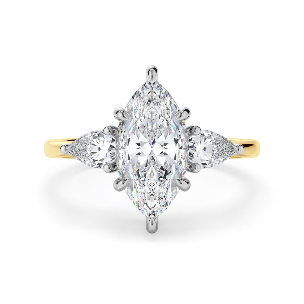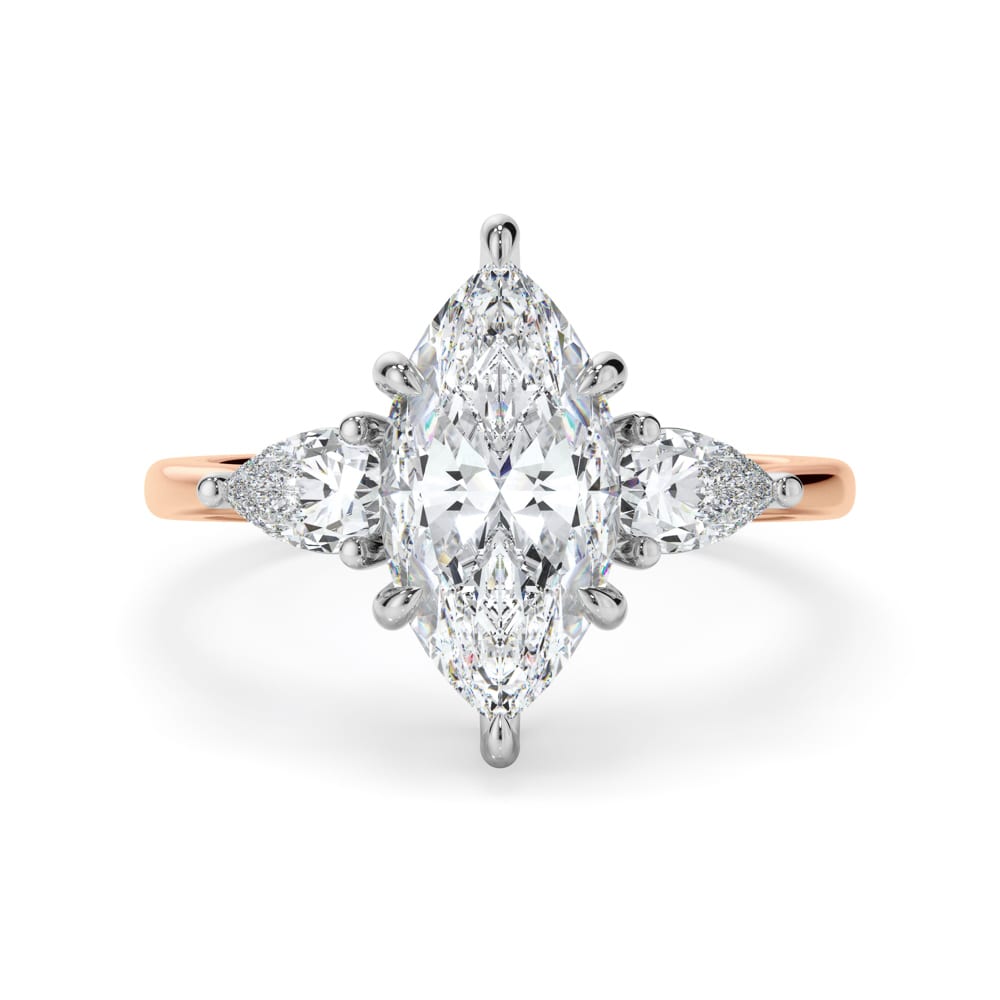 This 18ct gold trilogy engagement ring showcases a stunning marquise cut diamond, elegantly six claw set in white gold at the centre. Flanking the centre stone, pear cut diamonds are three claw set in white gold, adding balance and brilliance. The design is completed with a high polished 2mm rose gold band, a 6mm setting height, creating a refined and sophisticated silhouette. Expertly crafted by Robert Cliff Master Jewellers.