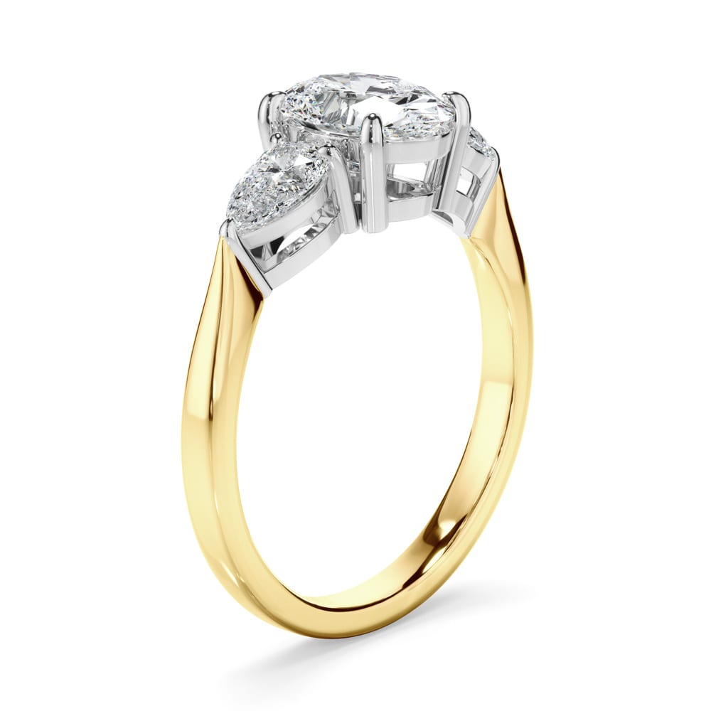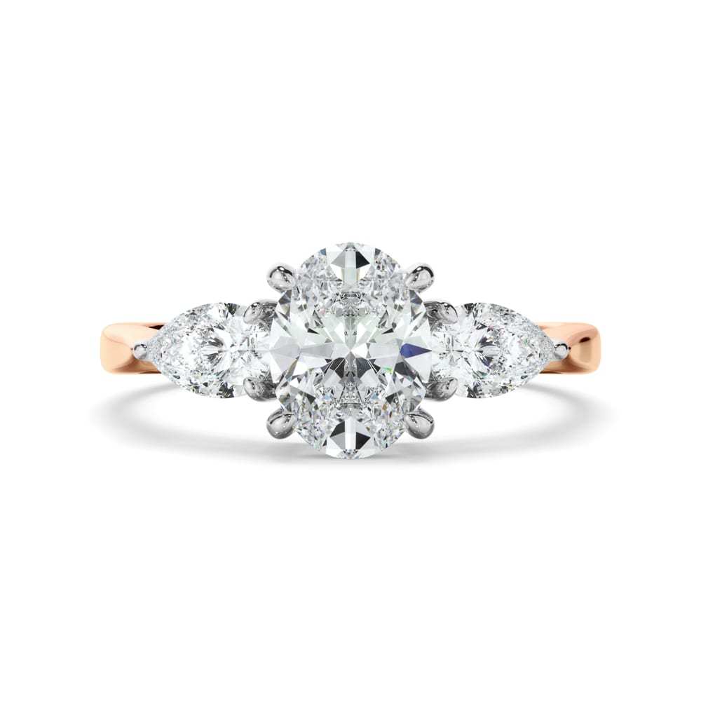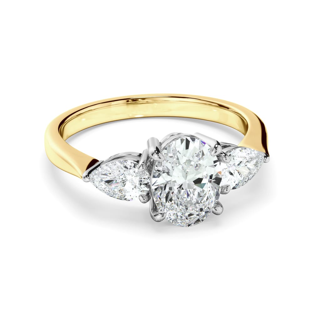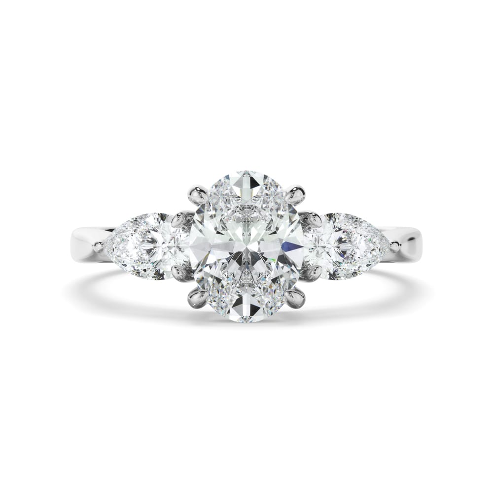 Crafted in 18ct white gold by Robert Cliff Master Jewellers, this timeless engagement ring features a stunning oval-cut diamond in a secure four-claw setting, accented by pear-cut diamonds in three-claw settings on either side. The high-polished band measures 1.8mm wide, with a setting height of 5.8mm , offering a delicate yet striking design.
