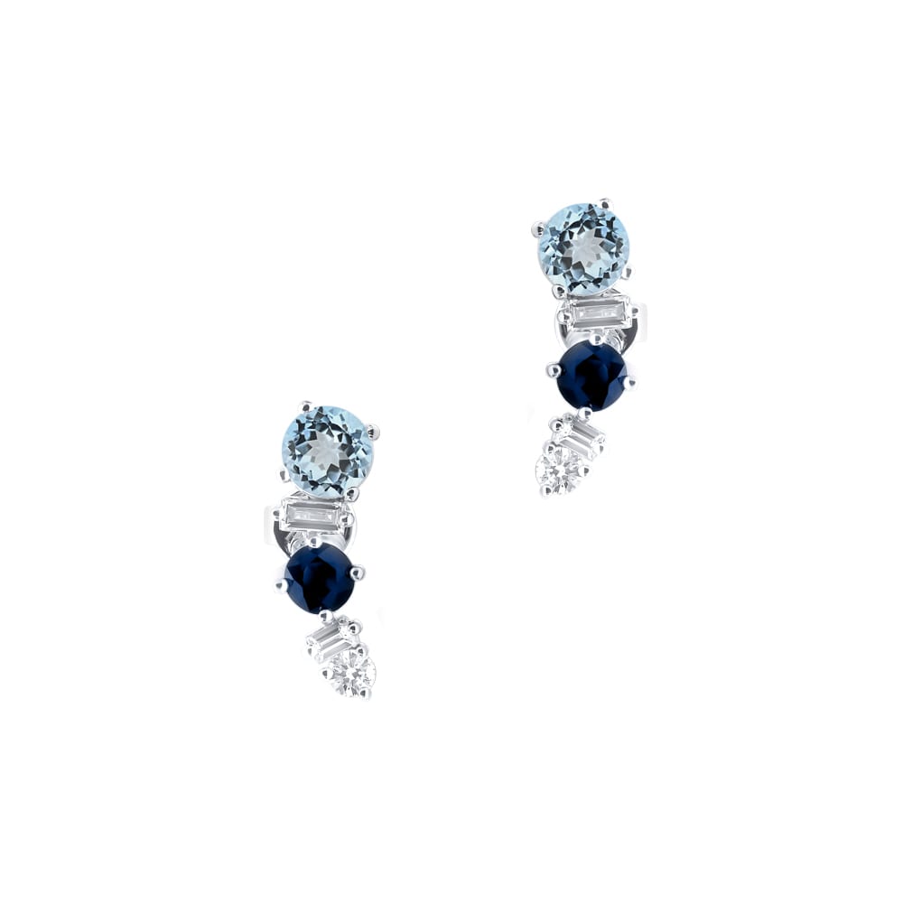 Crafted in 18ct white gold with secure post and butterfly fittings, these unique stud earrings showcase a striking arrangement of gemstones. Each earring features a four claw set round cut aquamarine, paired with a round cut blue sapphire, two baguette cut mined diamonds, and a brilliant cut mined diamond. A vibrant and elegant combination of colour and sparkle.