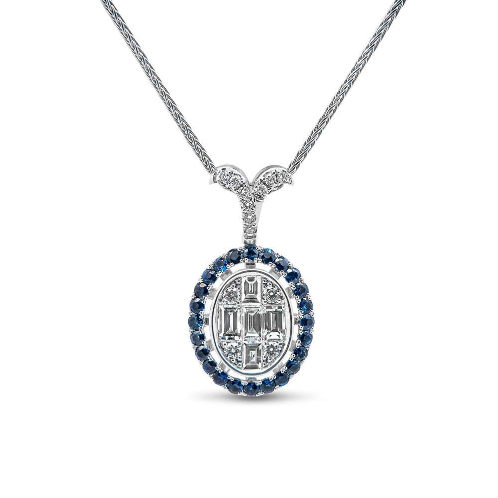 This Diamond and Sapphire Pendant features a beautiful array of baguette and round cut diamonds surrounded by a halo of sapphires, and additional brilliant cut diamonds on the bail. The pendant is crafted from elegant white gold, adding to its luxurious appeal. This pendant is perfect for special occasions or as a gift for a loved one.