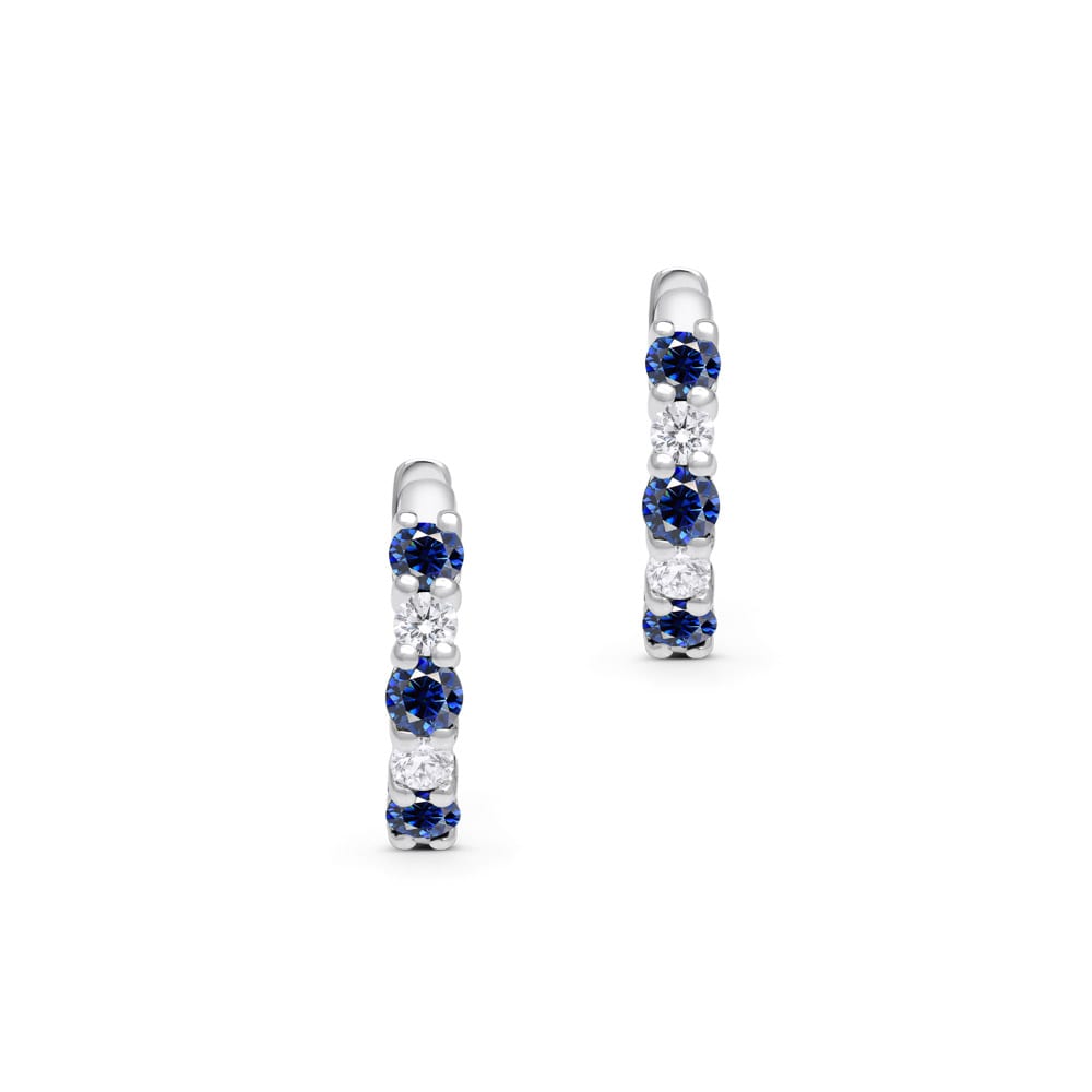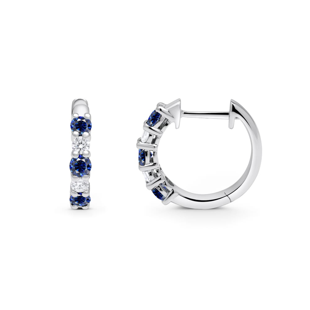 Elegant and versatile, these 18ct white gold huggie earrings feature a captivating arrangement of three round cut sapphires alternating with two brilliant cut diamonds on each earring. A timeless design perfect for adding a pop of colour and sparkle to any look.