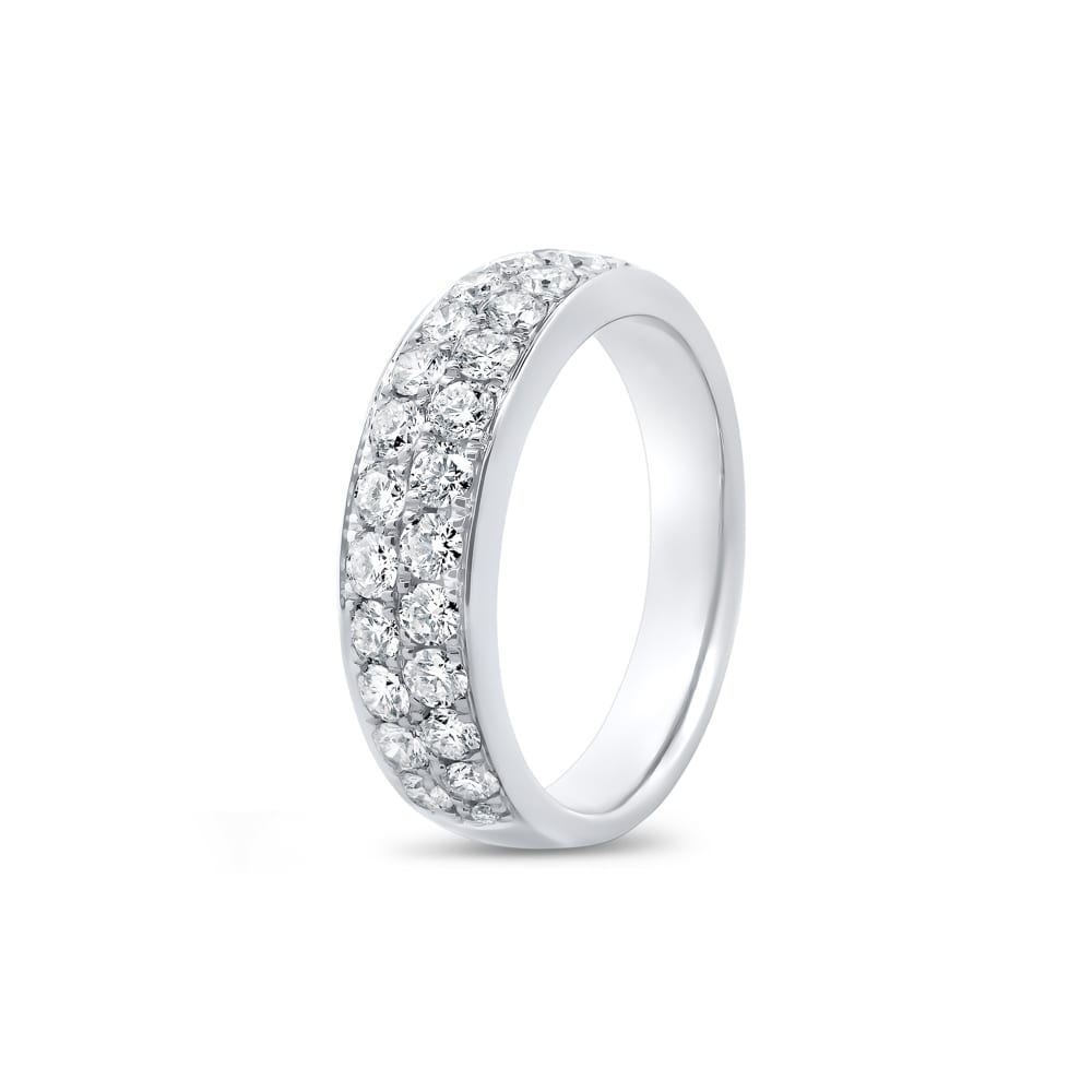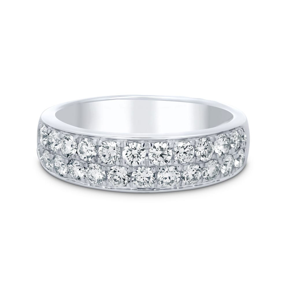 Crafted in 18ct white gold, this elegant diamond ring features two micro pavé-set rows of brilliant cut mined diamonds that shimmer across the top half of the band. The finely rounded design and high-polished finish create a sophisticated and timeless piece, ideal for stacking, daily elegance, or marking a special occasion.