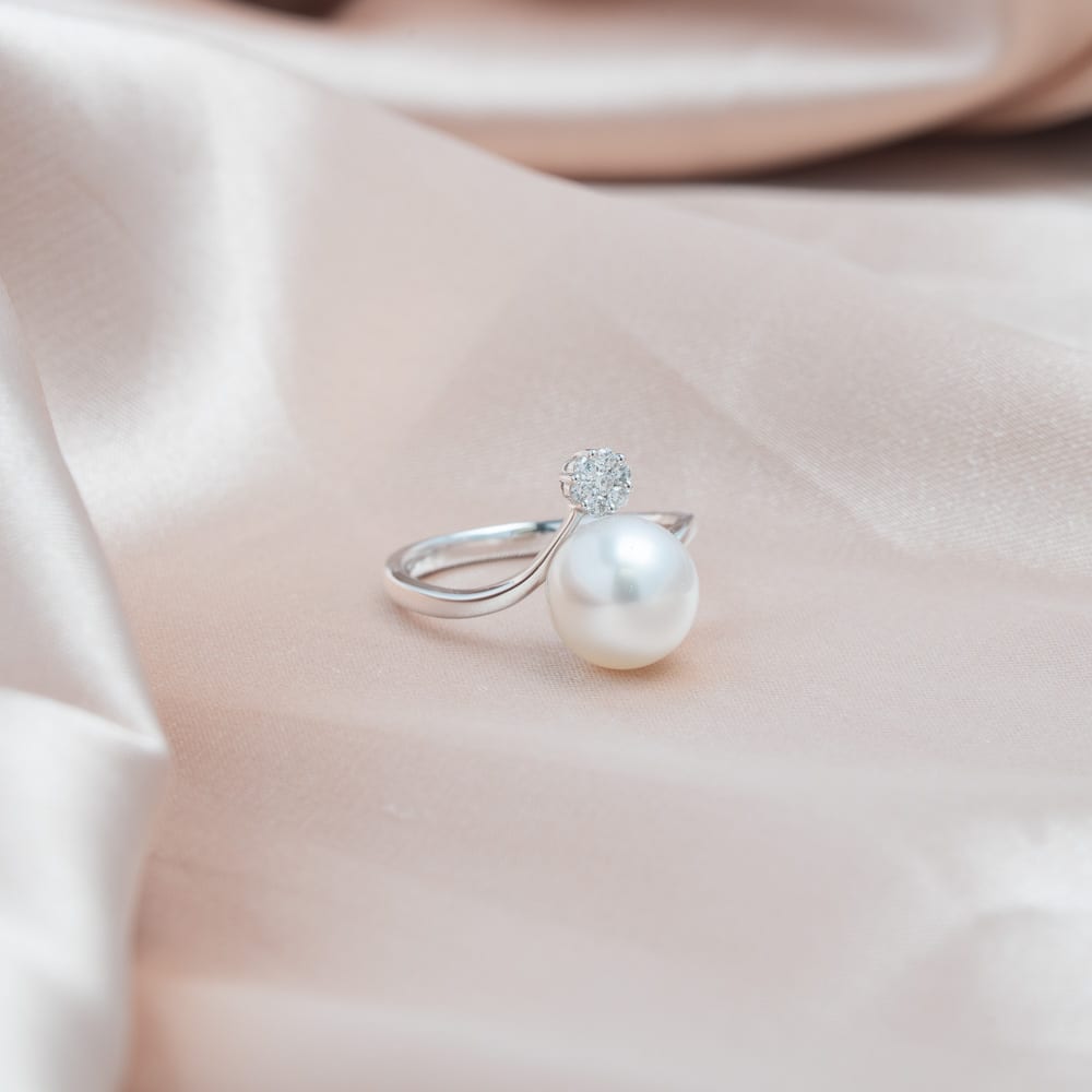 This graceful ring is crafted in 18ct white gold and showcases a radiant South Sea pearl. A gentle arc of brilliant cut mined diamonds frames the design, creating a timeless piece with understated elegance and luminous charm.