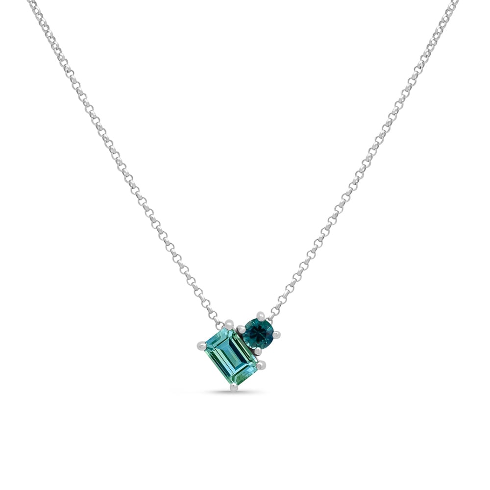 White Gold Pendant with Round and Emerald Cut Teal Sapphires