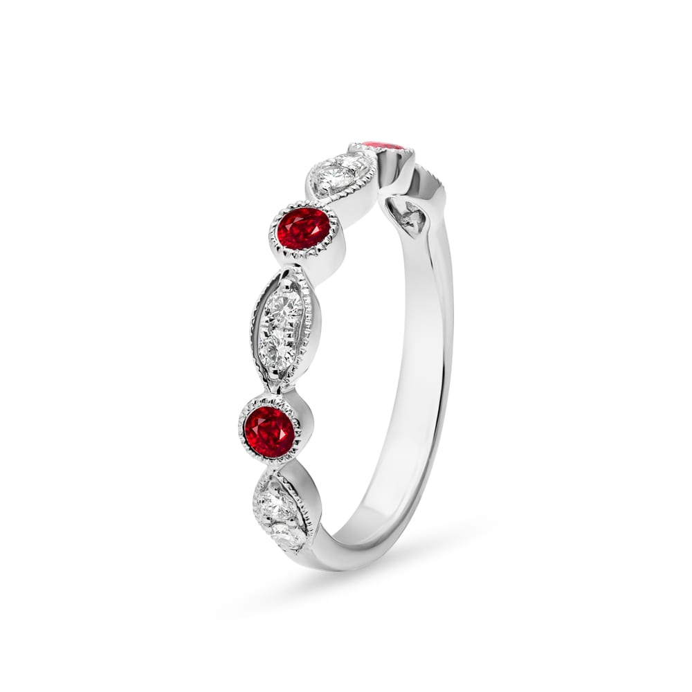 This stunning 18ct white gold ruby and diamond ring features a vibrant ruby at its centre, beautifully complemented by a band of Brilliant Cut Mined Diamonds. The diamonds enhance the rich red hue of the ruby, creating a perfect balance of sparkle and colour. This ring combines elegance with timeless beauty, making it an ideal addition to any jewellery collection.